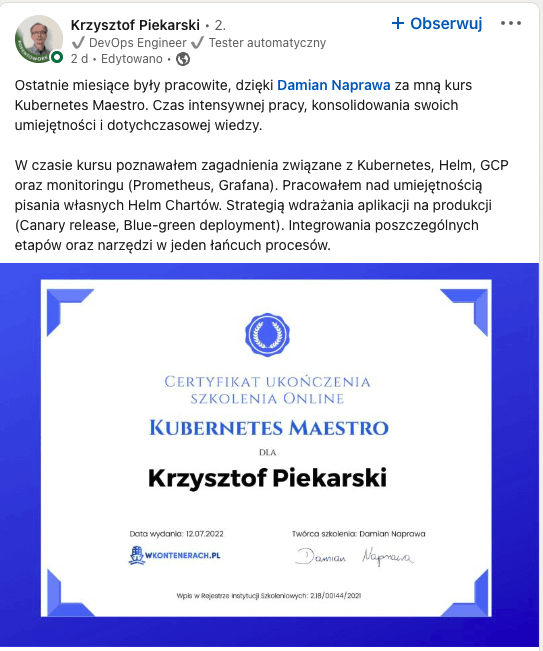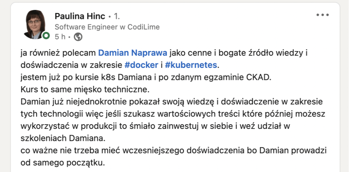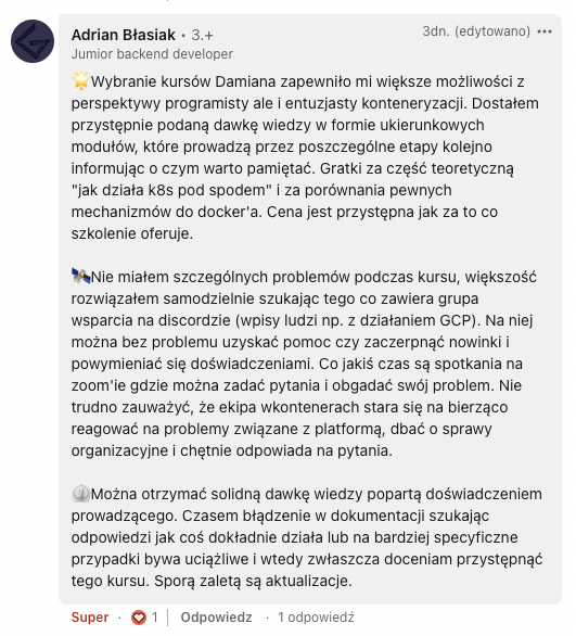 Dzięki kursowi szybciej osiągnąłem próg wejścia. Jestem w trakcie dwóch projektów i zaczynam się czuć jak ryba w wodzie. Firma przekonała się do Dockera, wprowadzam w ten temat kolejnych dwóch kolegów programistów.