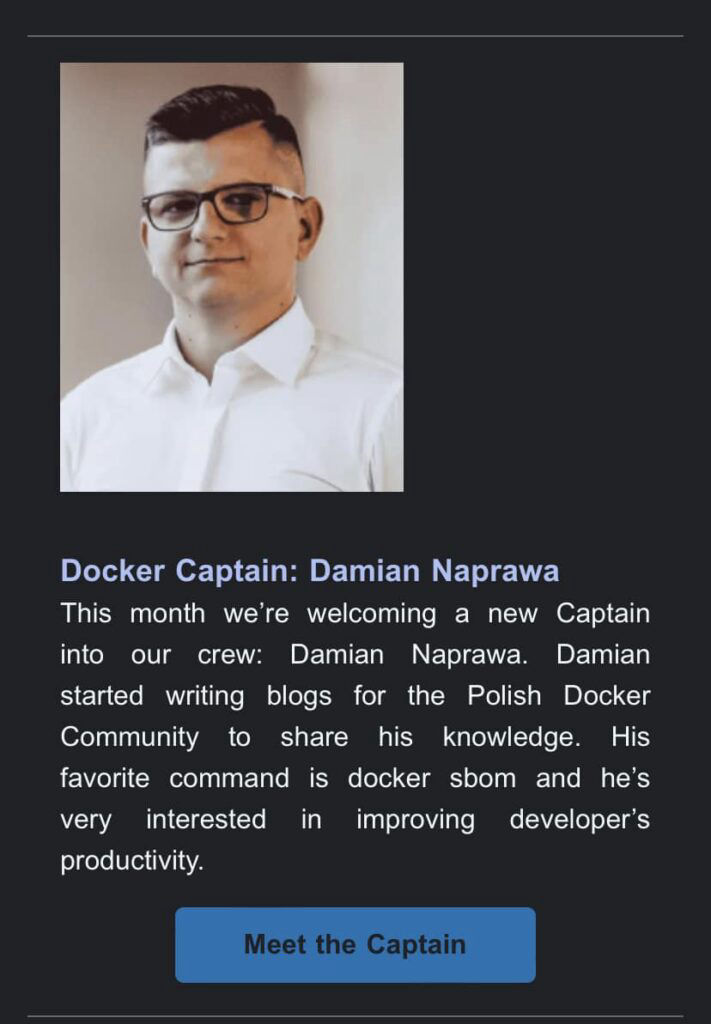 Otrzymałem od firmy Docker nagrodę i tytuł “Docker Captain” przyznawany wybranym ekspertom na całym świecie, którzy są najlepszymi specjalistami od technologii oraz wykazują zaangażowanie na rzecz społeczności.